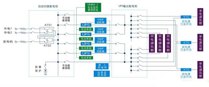 【項(xiàng)目?jī)?nèi)容】:基于對(duì)上海郵政儲(chǔ)蓄銀行用戶需求背景的綜合分析,針對(duì)金融系統(tǒng)大型數(shù)據(jù)和關(guān)鍵設(shè)備的網(wǎng)絡(luò)系統(tǒng)特點(diǎn),馳慶機(jī)電提出了以保證用戶負(fù)載的可靠供電為設(shè)計(jì)前提,同時(shí)具備高效節(jié)能特點(diǎn)的機(jī)房解決方案。此設(shè)計(jì)的此方案主機(jī)采用2套KELONG牌120KVA功率FR-UK系列UPS,構(gòu)成1+1冗余并機(jī)方案。優(yōu)勢(shì)有: